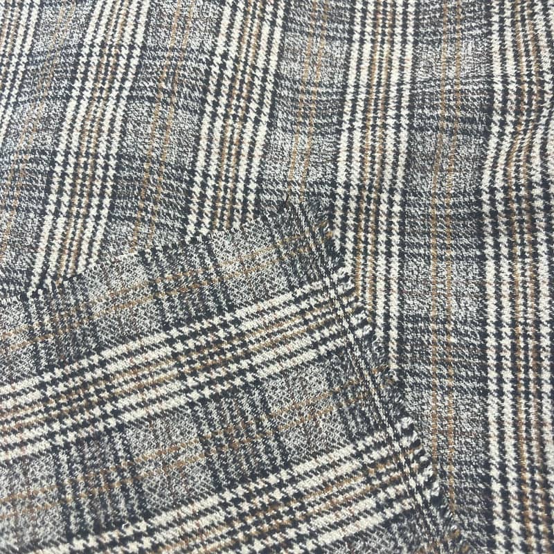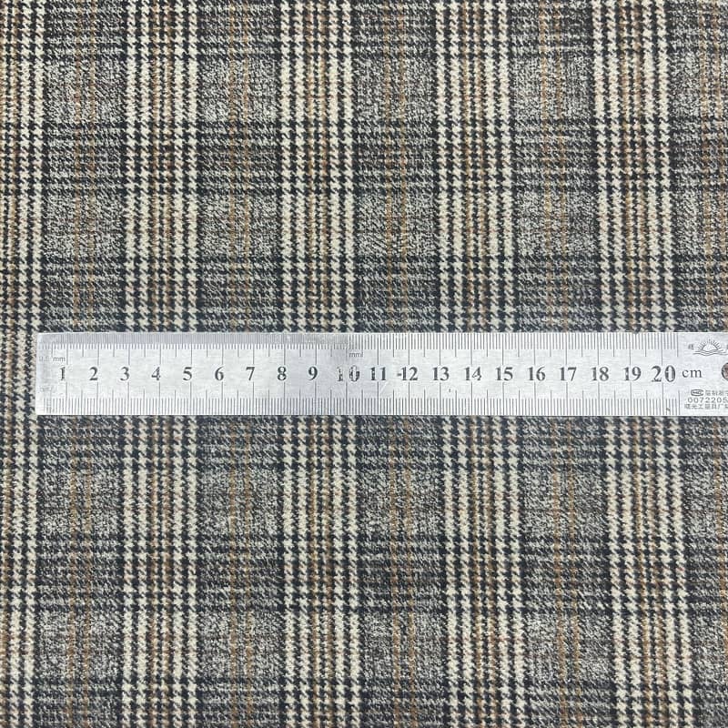 Is é an fabraic seo, atá ainmnithe mar airteagal 250515, teicstíle fite comhdhéanta de olann 20%, poileistear 75%, agus 5% spandex. Agus mais de 450g/m in aghaidh an aonaid aige, cuireann sé tógáil mheánmheáchain i láthair atá oiriúnach don fheisteas. Tá patrún seiceála plaid agus houndstooth comhtháite ag an bhfabraic, ag ionchorprú eilimintí snáth miotalacha le haghaidh codarsnachta amhairc. Soláthraíonn cuimsiú spandex thart ar 20-25% cumas stráice cothrománach, agus coinníonn an cumasc olann agus poileistear cobhsaíocht struchtúrach. Cruthaíonn an meascán seo de chomhdhéanamh snáithíneach agus de theicníc fíodóireachta fabraic le leaisteachas sainithe agus sainmhíniú patrún, rud a fhágann go bhfuil sé infheidhme maidir le baill éadaigh oiriúnaithe comhaimseartha a éilíonn mionsonraí soghluaisteachta agus aeistéitiúla.