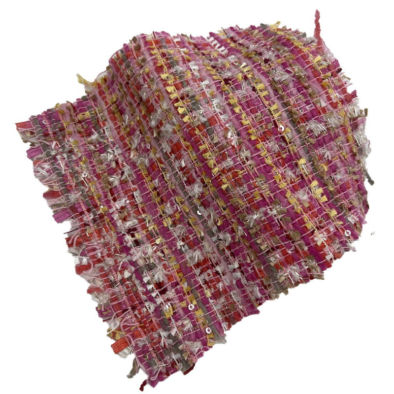 Is é an fabraic seo, atá ainmnithe mar airteagal 21003, teicstíle tweed comhdhéanta de 67% poileistear agus 33% aicrileach. Le mais in aghaidh an aonaid achar 385 gsm, cuireann sé tógáil mheánmheáchan i láthair. Ionchorpraíonn an fabraic sequins dearg agus bándearg in éineacht le snáth miotalach, comhtháite le linn an phróisis fíodóireachta chun dromchla frithchaiteach scaipthe a chruthú. Soláthraíonn an bonn poileistear cobhsaíocht struchtúrach, agus cuireann an chomhpháirt aicrileach le lochta agus uigeacht na fabraice. Is é an toradh a bhíonn ar an meascán seo ná ábhar a bhfuil frithchaitheamh solais ilchineálach agus toiseachas dromchla aige. Fágann na saintréithe teicniúla seo go bhfuil an tweed seo infheidhme maidir le baill éadaigh na mban ina bhfuil gá le heilimintí maisiúla agus sláine struchtúrach.