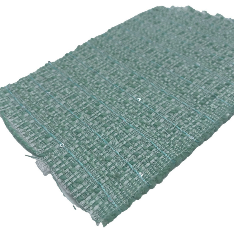 Is é an fabraic seo, atá ainmnithe mar airteagal 22102, teicstíle jacquard tweed comhdhéanta de 90% poileistear agus 10% olann. Le mais in aghaidh an aonaid de 320 gsm, cuireann sé tógáil éadrom atá oiriúnach do gúnaí. Tá patrún jacquard cabhraithe ag an mbonn glas éadrom, ina ndéantar sequins a chomhtháthú le linn an phróisis fíodóireachta chun limistéir fhrithchaiteacha áitiúla a chruthú. Cinntíonn an t-ábhar ard poileistear cobhsaíocht tríthoiseach agus coinneáil cruth, agus cuireann an chomhpháirt olann le hairíonna tadhlacha na fabraice. Mar thoradh ar an meascán seo tá ábhar le héagsúlacht uigeachta dromchla agus comhsheasmhacht struchtúrach. Mar gheall ar na saintréithe teicniúla seo tá an tweed jacquard seo infheidhme maidir le gúnaí ina bhfuil gá le leas dromchla maisiúil agus struchtúr éadaigh.
