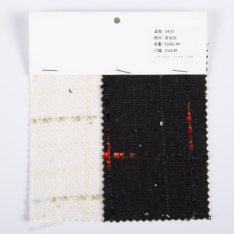 Glacann 3431 fite fuinneoige grille snáth féileacán sequin tweed teicneolaíocht fíodóireachta chun cinn. Tá gach orlach den fhabraic fite go cúramach chun patrún grille fuinneoige uathúil a fhoirmiú, atá íogair agus cisealta. Tugann eilimint grille na fuinneoige le tuiscint an elegance clasaiceach agus áilleacht trédhearcach, ag cur charm clasaiceach annamh le dearadh éadaí nua-aimseartha. Tá an creatlach inleagtha go cliste le sequins gan áireamh íogair agus lonracha. Faoin solas, astaíonn na sequins solas gealaí, cosúil leis na réaltaí is gile sa spéir na hoíche, ag cur só agus fantaisíocht gan teorainn leis an dearadh foriomlán. In éineacht leis an ábhar tweed clasaiceach, ní hamháin go bhfuil tionchar amhairc uathúil ag an bhfabraic seo, ach tá coinneáil teasa maith agus friotaíocht caitheamh aige freisin. Ní hamháin go gcoimeádann an meascán d'uigeacht tweed le sequins, gríleanna fuinneoige agus eilimintí féileacán an stíl retro de tweed traidisiúnta, ach tugann sé freisin mothú faisin gan fasach don fhabraic, rud a ligeann do na clasaiceacha agus na treochtaí imbhualadh go foirfe ag an nóiméad seo.